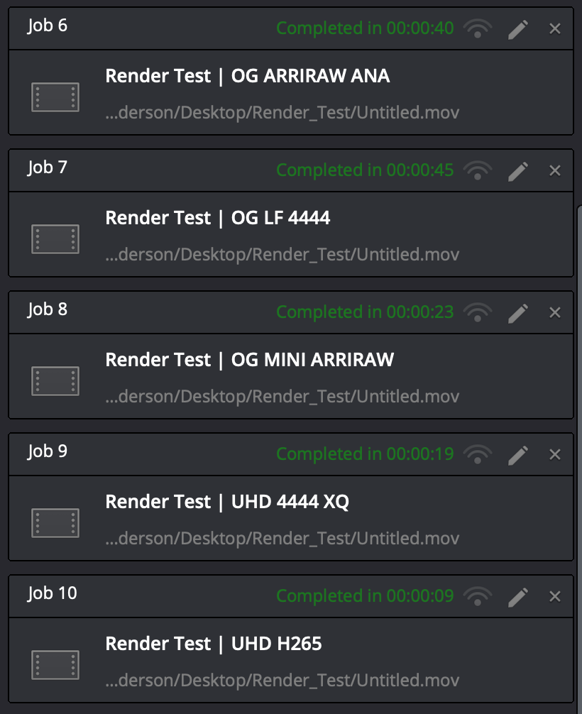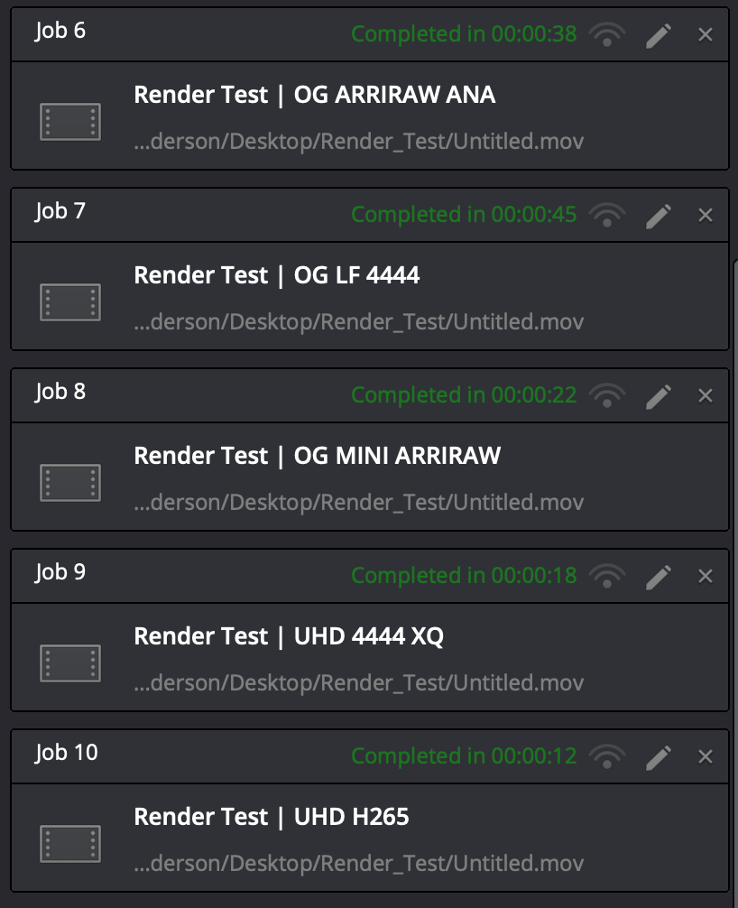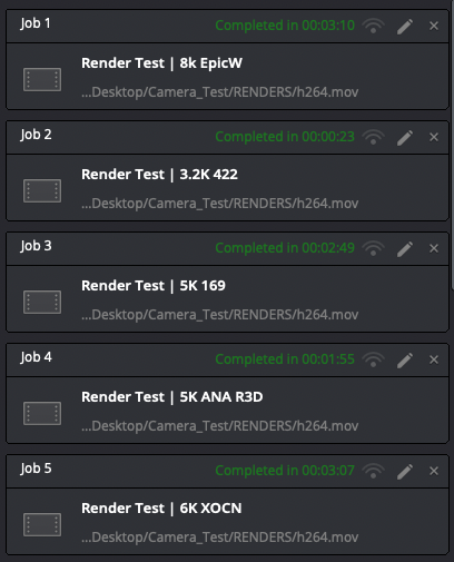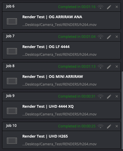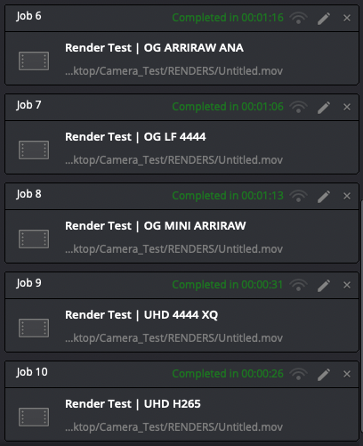 Anyways, here are the 10 timelines that I put together to test out rendering to ProRes Proxy (what I get asked to do almost 100% of the time) and H264 because these new processors are supposedly built to handle H264 natively (more hardware less software encoding). Each timeline is the source resolution & codec of each file (OG means Open Gate and ANA means Anamorphic (and doing the desqueeze) for those wondering).